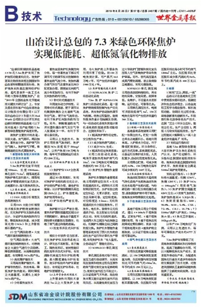 “SDM大型綠色智能焦?fàn)t技術(shù)”是山冶設(shè)計與意大利PW公司合作的代表世界一流工藝水平的大型焦?fàn)t技術(shù)。由山冶設(shè)計進行整體規(guī)劃及設(shè)計,采用了分段加熱、非對稱式煙道、薄爐墻、單孔調(diào)壓、火焰分析模型等技術(shù),具有技術(shù)成熟先進、結(jié)構(gòu)嚴密合理、單孔容量大、占地面積小、熱工效率高、自動化水平高、環(huán)保指標(biāo)先進等諸多優(yōu)點。在焦?fàn)t爐體、焦?fàn)t機械、工藝裝備、自動化和環(huán)保水平等方面代表國際先進水平。同時,在世界上首次運用焦?fàn)t爐內(nèi)脫硝工藝,氮氧化物排放指標(biāo)符合國家最嚴環(huán)保排放標(biāo)準。