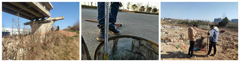 本次現(xiàn)場實測數(shù)據(jù)包含現(xiàn)狀鐵路橋橋墩坐標、橋梁凈空,已建設(shè)道路交叉口坐標及高程,已施工雨、污水井坐標及井深等,測量項目涉及到“陽邏之心”50多萬平方米二十余條道路,測量范圍廣闊,測量目標眾多,而測量人員僅為王學皓、吳修業(yè)及二十冶測量技術(shù)員陳工,實測任務(wù)異常艱巨。現(xiàn)場多為半施工或未施工道路,測量情況十分復雜,并同時遭遇武漢強降溫天氣,踏勘工作面臨極大考驗。尤其在雨污水井數(shù)據(jù)測量方面,部分道路車流量較大,需搭設(shè)臨時圍擋保證測量安全;部分重型井蓋受重載車輛碾壓密實變形,現(xiàn)有工具簡陋,僅打開井蓋這一項往往需要數(shù)十分鐘,完成單個井數(shù)據(jù)測量至少需要一個多小時,遠遠超出預(yù)估時間。與時間節(jié)點競速,測量人員踏霜踩露而出,披星戴月而歸,歷經(jīng)四天全力以赴、克難攻堅,圓滿完成所有測量任務(wù),為設(shè)計工作順利進行提供了有力的數(shù)據(jù)支持。