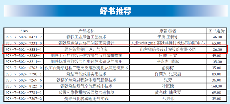 冶金工業(yè)出版社、世界金屬導(dǎo)報(bào)社等面向全國讀者推薦了我公司編著的《綠色智能鋼廠設(shè)計(jì)與創(chuàng)新》。