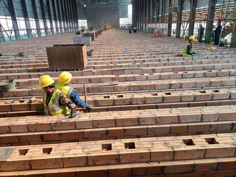 云煤能源焦化升級項目建設(shè)的7.6m頂裝焦?fàn)t,2座焦?fàn)t用磚量7萬噸,磚型多達1000多種,磚型復(fù)雜,對耐材生產(chǎn)供貨及管理要求很高,公司領(lǐng)導(dǎo)在耐材訂貨時就高瞻遠矚十分重視、派遣數(shù)位人員駐廠監(jiān)制,云煤焦?fàn)t砌筑工期十分緊張,加上現(xiàn)階段國內(nèi)新建焦?fàn)t較多耐材供應(yīng)本就較緊張,以及受疫情以及冬奧會影響,生產(chǎn)供應(yīng)更加困難。云煤1#焦?fàn)t砌筑時間與山冶負責(zé)設(shè)計與項目管理的山西盛隆泰達項目砌筑時間相近,且粘土磚生產(chǎn)廠家均包含濟源耐火爐業(yè),粘土磚供應(yīng)保障壓力極大。為了保證砌筑進度,云煤項目部積極協(xié)調(diào)各方、千方百計保證耐材供貨以滿足砌筑需求。一方面派遣專業(yè)工程師駐廠催交監(jiān)制,另一方面協(xié)調(diào)其他耐材生產(chǎn)廠家協(xié)助粘土磚生產(chǎn)保供應(yīng)。項目管理分公司負責(zé)耐材管理的石景林,每天不辭辛苦聯(lián)系廠家發(fā)貨、溝通到貨時間、協(xié)調(diào)施工方卸貨,晚上還要統(tǒng)計每天10~20車數(shù)百個磚號的到貨量。在耐材砌筑質(zhì)量管理方面,我們外聘了2位有豐富施工與砌筑經(jīng)驗的老同志,為焦?fàn)t砌筑施工質(zhì)量保駕護航。