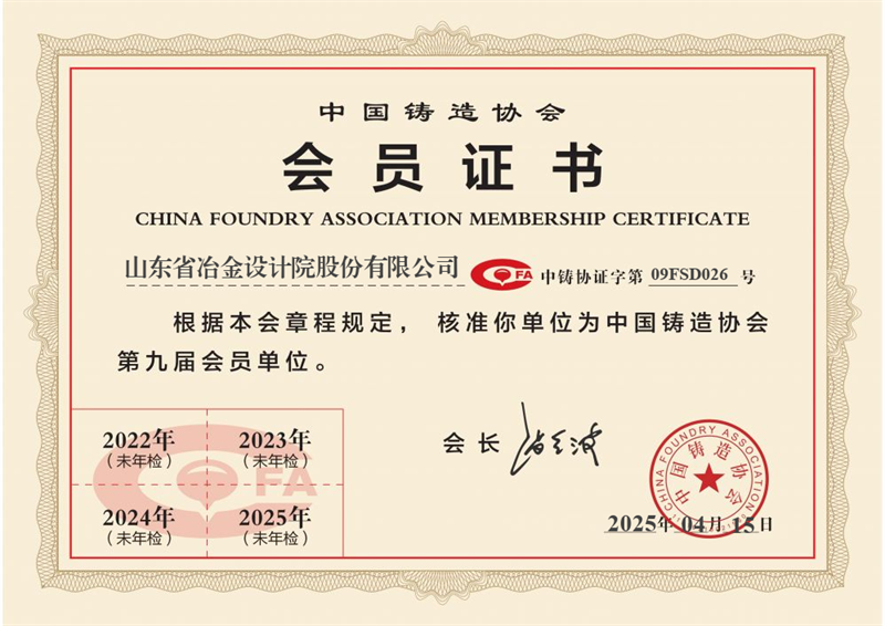 經(jīng)過前期準(zhǔn)備工作及入會(huì)申請(qǐng),4月15日中國(guó)鑄造協(xié)會(huì)核準(zhǔn)山冶設(shè)計(jì)成為協(xié)會(huì)會(huì)員單位(會(huì)員編號(hào)09FSD026)。