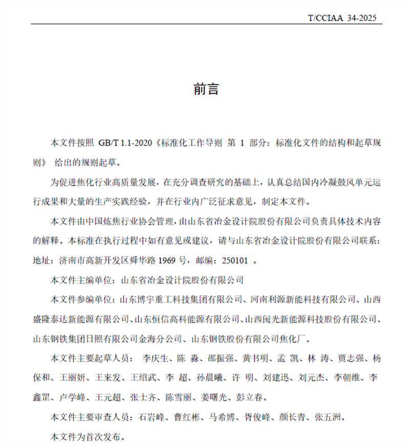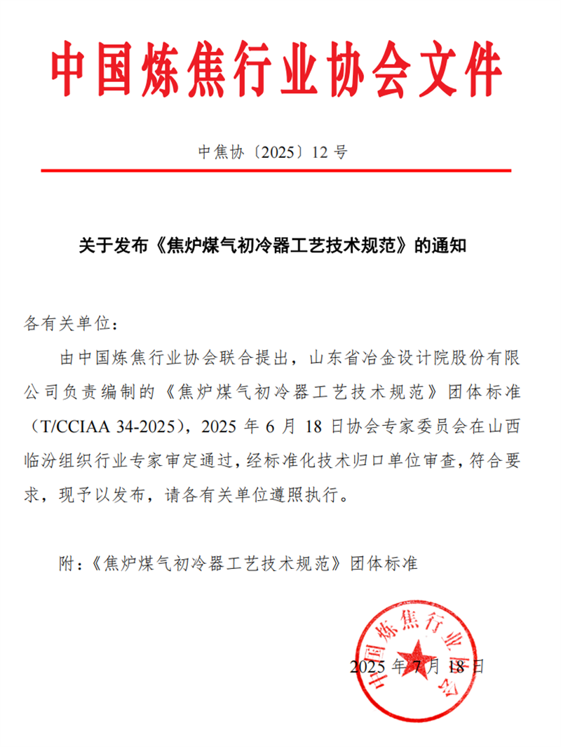 7月18日,由山冶設(shè)計主編的《焦爐煤氣初冷器工藝技術(shù)規(guī)范》T/CCIAA 34-2025(簡稱《規(guī)范》)正式發(fā)布并實施?!兑?guī)范》對焦化煤氣凈化初冷器的工藝流程、操作參數(shù)以及質(zhì)量指標作出了詳細規(guī)定,同時統(tǒng)一了初冷器的設(shè)計與操作標準,保障了煤氣冷卻過程的高效性與安全性?!兑?guī)范》的發(fā)布與實施,可指導(dǎo)焦化企業(yè)在生產(chǎn)過程中有效把控初冷器的日常操作,為后續(xù)煤氣凈化及深加工的穩(wěn)定運行創(chuàng)造有利條件。這是繼2024年7月1日正式實施、山冶設(shè)計主編的《焦爐煤氣脫硫廢液干法制酸技術(shù)規(guī)范》YB/T6115 - 2023之后的又一個行業(yè)規(guī)范,充分體現(xiàn)了山冶設(shè)計在焦化行業(yè)的技術(shù)引領(lǐng)作用與品牌影響力。