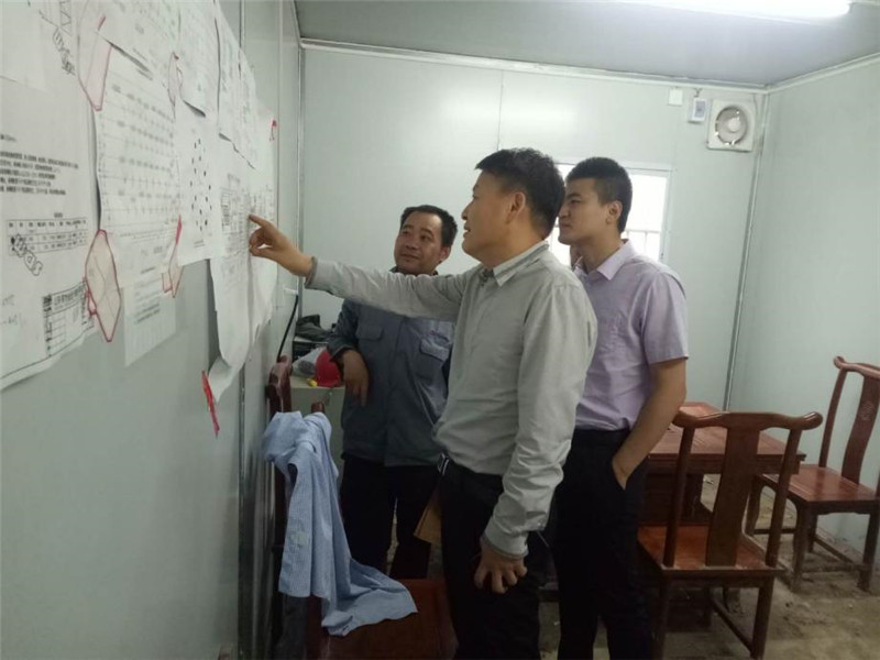 會談之后,宋總到施工現場考察指導高爐公輔項目及污水處理項目工作。在高爐公輔項目施工現場辦公室里,宋總對照著墻上張貼的項目進度計劃及樁基平面圖,詳細了解項目的進展情況,并在考察現場后,認真聽取了項目部對施工進度、質量、安全管理的工作匯報,宋總對項目部管理人員的辛勤工作表示了肯定,并針對工程難度大、樁基分包單位力量弱、價格低等存在的困難做出了部署。